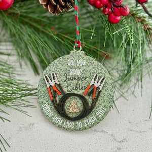 Add a spark of humour to your holiday tree with this quirky jumper cable Christmas ornament. Featuring a festive green background, detailed mini jumper cables, and the playful phrase “Got you some jumper cables since you like to start sht”*, this piece is sure to bring laughter and personality to your holiday décor.